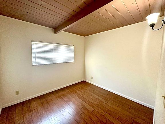 Ready to move in condition, 2 Bedroom, 1 Bath, with private garage and a private patio is available to rent. This 800 SF 4-plex apartment unit has carpet and vinyl flooring freshly cleaned with open beam wood ceilings and wood trim accents in the kitchen. The sliding glass doors open up to a calming greenbelt with trees and plants in the backyard. Heating is provided from a gas wall heater. The appliance package provides you with a New Electric Stove/Range, New Refrigerator and a shared washer/dryer on site. There is also plenty of guest parking if needed.