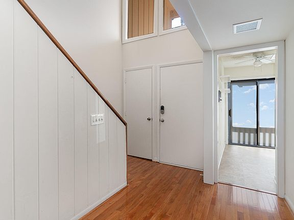 Contemporary lightingStylish shelvingCeiling fansHardwood floorsLarge picture windowsDramatic accent wall