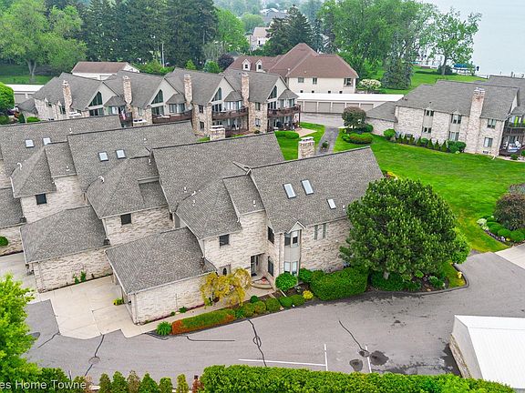 2 bedrooms PLUS spacious loft, which could be additional (THIRD)bedroom. Soaring cathedral ceilings & beautiful sky lights provide tons of natural light and spaciousness. Private elevated balcony w/ access from living room and master suite provide exceptional view of Lake St Clair. Cherry kitchen w/ ceramic floor. Master suite has private bath w/ Jacuzzi tub & separate shower. Gas fireplace in living room. Private basement has half bath and additional storage, or add another 700+ square feet of living space. One-car attached garage PLUS additional one-car detached garage. Walking distance to Brandenburg Park. All appliances included. Super clean and ready for immediate occupancy. Boat wells are frequently available for rent. HOA fees are $411/ month. Covers all outside maintenance (lawn and tree care, snow removal), roof, painting and pest control. 1 pet under 30 pounds is allowed .
