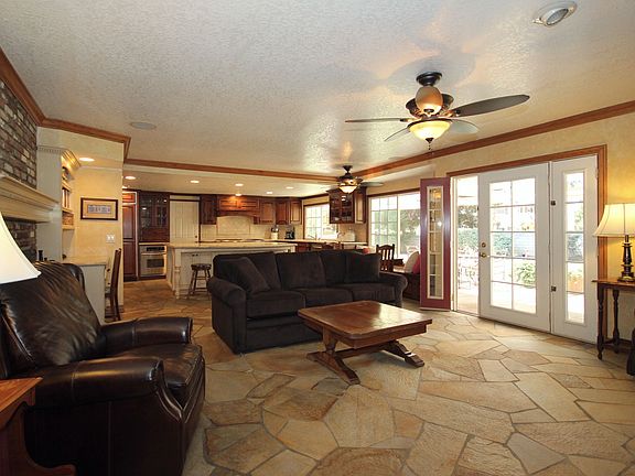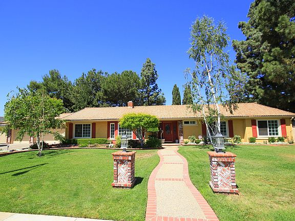 Complete info: http://5075oldranchroad.NiceFamilyHome.com - Beautiful custom-built single story pool home on a double lot in north La Verne located close to Oak Mesa Elementary. Curb appeal includes a large grassy front lawn with mature landscaping and brick accents. As you enter through the front door, you'll find wood flooring in the formal entry and a large formal living and dining room with a fireplace surrounded by built-in cabinetry and an over-sized picture window. Sitting adjacent to the dining room, is the newly remodeled kitchen including custom cabinetry, an over-sized island with seating, stainless steel appliances and granite counter tops. There is a built-in breakfast nook and stone flooring that flows into the open family room. Custom built-ins, a large brick fireplace and views of the pool make this the perfect space for gatherings. The master features a walk-in closet, dual vanities, a custom tile bath/shower combo and backyard access. There are 3 more bedrooms and bathroom with a dual vanity. A true retreat, the resort style backyard offers a sparkling pebble tech pool, hot tub, mountain views, putting green, grassy lawn, covered patio and a large gazebo. Crown molding, dual pane windows and indoor laundry center add to this home's appeal. There is a 3 car garage with storage and RV parking.