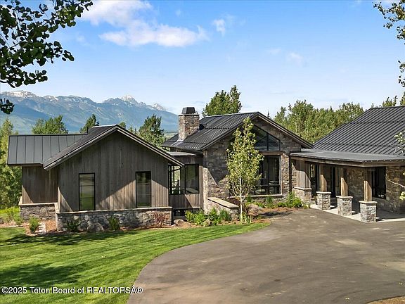 Introducing Eagle View - Floor to ceiling glass windows frame the Grand Teton perfectly in this new construction in Riverview Ranch. Spanning 6,869 square feet, this home features five bedrooms and seven bathrooms, all a testament to meticulous craftsmanship. The great room, drenched in southern light, situated in the heart of the home, seamlessly integrates living, dining, and entertainment spaces. Bi-folding glass doors transition from the dining area to an expansive deck, set against the panoramic Teton Range — a perfect stage for hosting. The open-concept kitchen boasts Wolf Sub-Zero appliances, a cozy breakfast nook, and a striking waterfall island edge, ready for any gourmet chef. The lower-level features four generous guest suites that are anchored by a game lounge, wet bar, and family room. An outdoor fire pit and hot tub create an oasis for relaxation or a vibrant social hub. Its three-bay garage and generous mudroom with ski lockers ensure ample space for activities in any season. With direct access to the Bridger Teton National Forest, this home is more than a residence - it's a call to adventure.