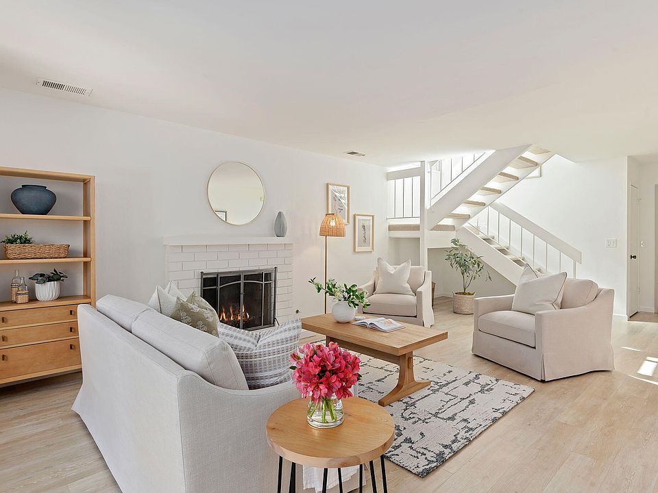 Enjoy Santa Barbara living in this nicely updated 2 bdrm/1.5 ba end-unit townhome. Nestled in a serene area of San Antonio Village, this beautiful unit backs to natural green space. Offering 1,476+/- SF, upgrades include fresh paint & luxury vinyl plank flooring, quartz countertops & stainless steel appliances in the kitchen, dual pane windows, stylishly remodeled baths & A/C. The open floor plan downstairs features a gas fireplace in the living room, a dining area, convenient half-bath, in-unit laundry w/ washer/dryer & a large sliding glass door that opens to a fully fenced patio. Upstairs, both bedrooms boast soaring wood beam vaulted ceilings, a large walk-in closet in the primary & a Jack & Jill bath. A single carport with lockable storage completes this turn-key townhome. Located within the sought-after Foothill & La Colina School boundaries, San Antonio Village offers a resort-like community pool & spa, wading pool, sauna, clubhouse with kitchen, beautifully landscaped common area & easy access to bike path, beaches & UCSB.