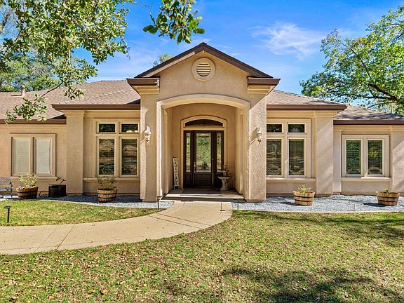 Gorgeous single-story home on five private and usable acres! Ideally located just minutes from Hwy 50, shopping, and local amenities.Step inside to an open and inviting floor plan filled with natural light. Soaring 12-foot ceilings, new carpet and beautiful engineered hardwood floors flow through the entry, kitchen, and dining areas. The spacious great room features large picture windows, a cozy fireplace with stone accents, while the sizable kitchen offers granite tile countertops, a gas cooktop, built-in oven and microwave, breakfast nook, dining bar, and walk-in pantry. The primary suite is a dream, with outside access and a luxurious bath featuring a soaking tub, dual sinks, walk-in shower with dual shower heads, tile finishes, and both a walk-in and secondary closet. The additional 3 bedrooms are generously sized, with one offering the flexibility to serve as an office or den. A full hall bath and a convenient half bath for guests complete the layout. The laundry room with sink and storage cabinets leads to the large three-car garage. The front and back yards are beautifully maintained, while the rest of the acreage offers endless potential space for a pool, animals, gardens, or future buildings. Relax on the large covered back patio and soak in the private wooded views.