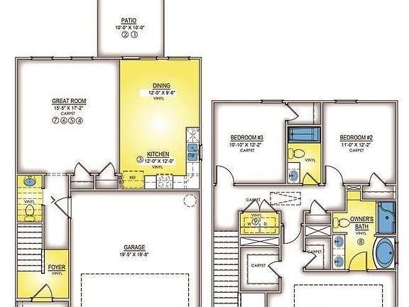 Welcome to the Hidden Creek II! This open concept plan features large great room, dining area, great kitchen with island and two-story foyer. This plan features a patio in the backyard. Second story offers convenient laundry area, oversized owner’s suite with two walk-in closets, garden tub and separate shower, and double vanities. Two additional bedrooms and another full bath complete this great home.