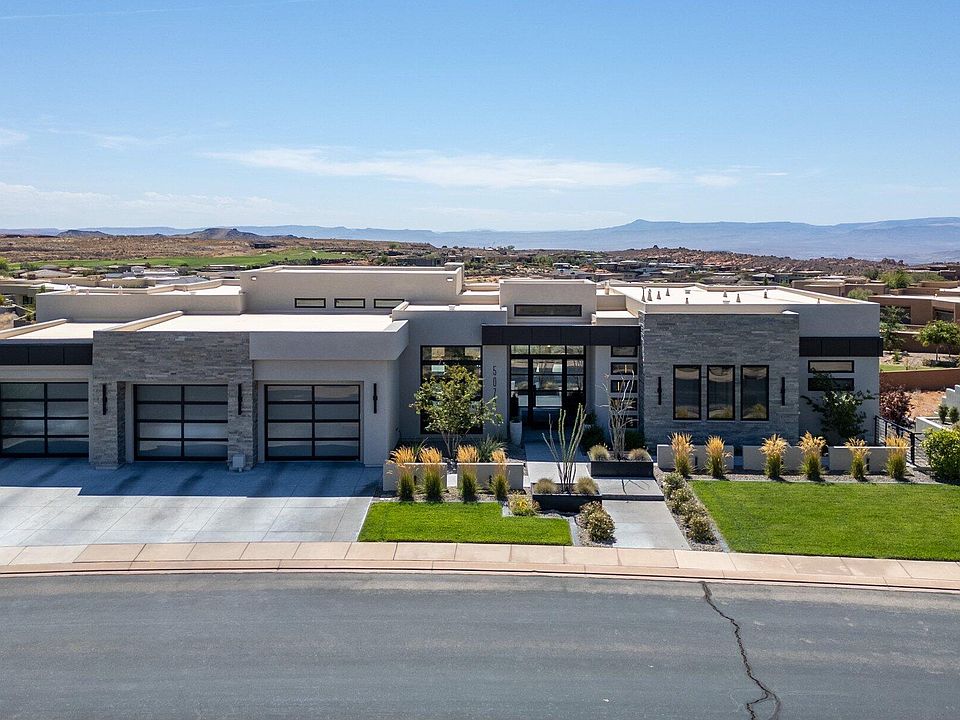 Entering through the striking metal-glass front door into a bright, open floor plan filled with tall glass sliding doors and modern fixtures that take in plenty of natural light and the surrounding sweeping mountain vistas. The kitchen is a showstopper with floor-to-ceiling cabinets, double waterfall quartz island, premium finishes, and 14' ceilings . A flexible gym or 4th bedroom comes with its own bath, while the spacious primary suite boasts large windows, a soaking tub, shower room with double shower heads, quartz double sinks, and a massive walk-in closet. Stackable sliding doors in both the living room and kitchen create seamless indoor-outdoor flow to the backyard retreat—complete with a sparkling pool and Shamu shelf, gazebo pickleball court, fire pit, and in-ground trampoline. Three individual garage bays provide plenty of parking and storage. This is a modern entertainer's dream with all the right touches for year-round enjoyment.