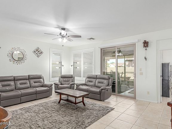 MOVE IN READY! Beautifully Updated, popular Riviera Model with 2 Bedroom + Den with High-End Finishes! This stunning home shines with fresh interior and exterior paint. The open kitchen features new granite countertops with custom backsplash. stainless appliances, RO system, and flows seamlessly into the living and dining areas. Enjoy all-tile flooring, plantation shutters, epoxy-coated garage and patio, and a 4' extended garage with cabinetry. Additional upgrades include a new AC with air purification, solar screens, and ceiling fans. The backyard retreat offers an oversized pergola, screened-in patio, and lush landscaping with PVC irrigation, seating area, pavers and hot-tub. Perfect for entertaining, this move-in-ready home won't last!