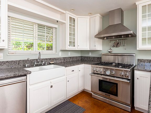 The kitchen has stainless steel appliances including a Thermador oven range, Thermador dishwasher, and Viking refrigerator.