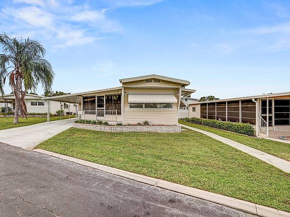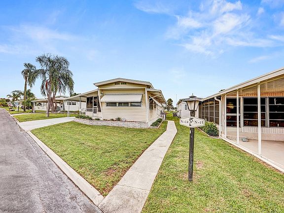 Welcome to Village on the Green, a beautiful 55+ GATED community in Bradenton, Florida! The community is close to plenty of shopping and dining, and just 15 minutes from Anna Maria Island! This home has SO MUCH OUTDOOR LIVING SPACE, it's really incredible! The carport is massive, easily fitting two cars. In the back, there is a large covered area that could be screened in to add more living space, or kept as-is for al fresco entertainment. The Florida room is massive, with sliding vinyl windows that provide incredible air circulation. The living space is open, with the living room, kitchen, and dining space flowing completely together. The second bedroom is a generous size and has an ensuite half bathroom. The master bedroom is spacious, and has jack and jill access to the full bathroom. Out back is a detached storage shed with the washer and dryer. The home is being sold FURNISHED as seen in the photos and is ready for a quick closing! The community is amenity rich. Not only is it a gated community, but amenities include clubhouse, pool, hot tub, fitness room, game room, and library. New owners will pay $1090 for lot rent; $35.29 for trash; common area pass-thru electric fee of $5.74; common area utility fee of $11.56; and water with a base rate of $30.00 and after that up to 9%. Lawn care is optional at $37. Electric is at your own expense, but there is a new bulk Spectrum package in the park for $80 per month. Sorry, this is a NO PET park. All listing information is deemed reliable but not guaranteed and should be independently verified through personal inspection by appropriate professionals. Integrity Mobile Home Sales cannot guarantee or warrant the accuracy of this information, measurements, or condition of any property. Measurements are approximate. Lot rent is subject to change.