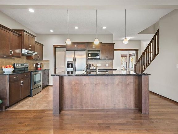 Rich hardwood floorsCozy gas fireplaceDark cabinetryStainless steel appliancesGranite countertopsImpressive oversized islandMain floor flex room