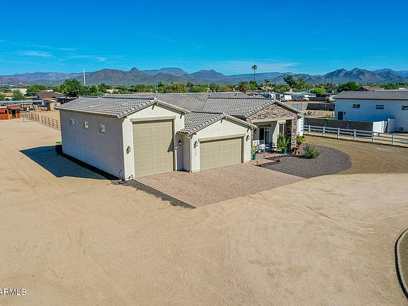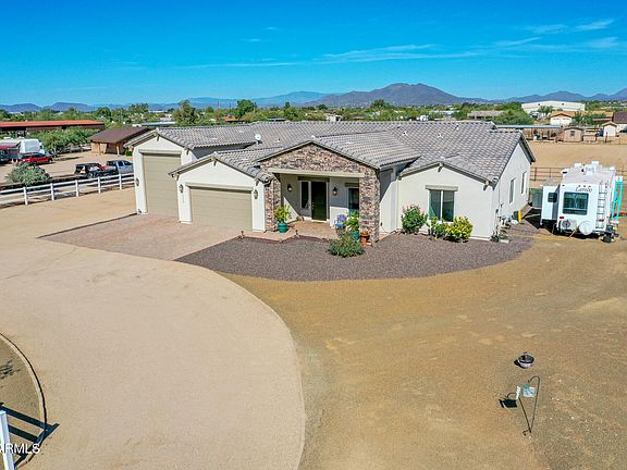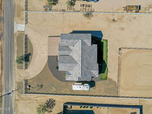 the large rear patio. Master bathroom has dual sinks, huge soaking tub and separate large shower. Spacious walk-in closet includes linen storage. Two car garage, 8' and over 50' RV garage, epoxy floor and 50 amp plug. Backyard includes huge horse riding/jumping arena,