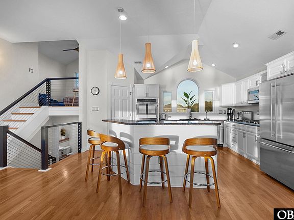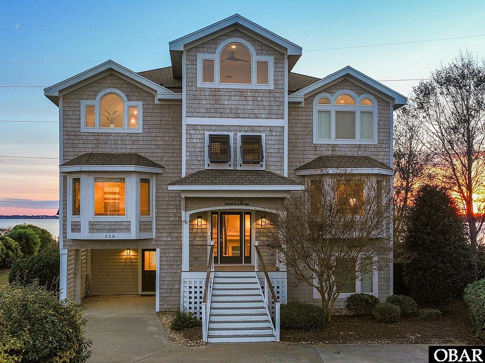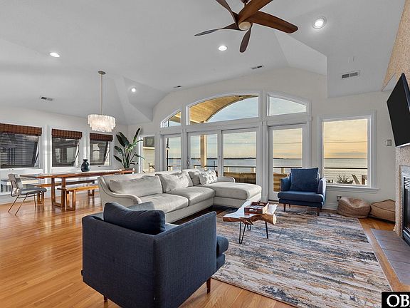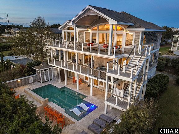 Set along the sound in the gated community of First Flight Ridge, Sunset at Tiffany’s is a fully furnished 7-bedroom, 6 full and 2 half bath coastal retreat offering a resort-style experience tailored for unforgettable entertaining and elevated soundfront living. With unobstructed views over Kitty Hawk Bay, this sanctuary stuns at every level, from the showstopping outdoor oasis featuring a gunite pool with waterfall, swim-up bar, hot tub deck, and travertine lounge space, to the private dock across the Bay Drive multi-use path where sunsets paint the sky and paddleboarders drift by. Inside, the reverse floor plan soars with vaulted ceilings and natural light, highlighting a fully renovated chef’s kitchen with GE Monogram appliances and a top-level primary suite complete with sauna, steam shower, and custom cabinetry. Multiple en-suite bedrooms ensure comfort and privacy, while updates like 2020 Trex decking with cable railings, cedar shake siding, Bahama shutters, and natural gas conversion add effortless value and peace of mind. This season, the home generated over $142K in rental income, with the owners still reserving six peak weeks for personal use. Tucked in a waterfront cul-de-sac in a private community just minutes from the beach, shopping, and dining, Sunset at Tiffany’s is both a high-performing investment and a statement home for those who crave epic sunsets, breathing room, and passive income potential.