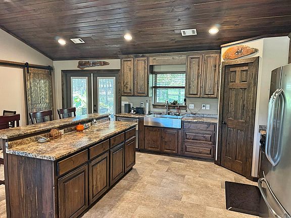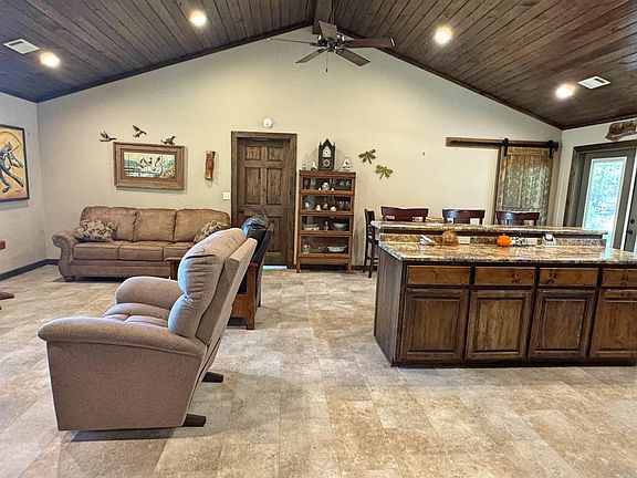 This home has 1,797 sq. ft. of total living space, including a 1,557 sq. ft. main house featuring 3 bedrooms and 2 bathrooms. The open floor plan has vaulted ceilings with rich wood finishes, a beautiful stone fireplace, and brand-new flooring throughout. The kitchen offers stainless steel appliances, beautiful wood cabinetry, and plenty of counter space. Relax on the back porch while enjoying the peaceful view of your very own koi pond with a waterfall, surrounded by trees and nature. This property sits on 6.3 acres, giving you room to spread out and enjoy country living while still being close to town. In addition to the main home, there’s a 2-car carport with a finished 240 sq. ft. bonus space that includes two rooms and a half bath. This flexible area would make a great mother-in-law suite, office, craft room, or guest quarters. A storage shed is also included. The whole house generator gives you peace of mind. If you’ve been looking for a move-in ready home with charm, privacy, and acreage, this one checks all the boxes!