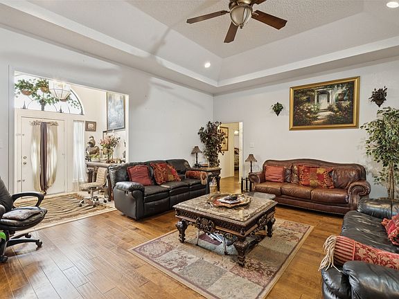 Beautiful, sprawling one-story home on a serene one-acre lot, perfectly situated in the heart of the neighborhood. This inviting residence offers a thoughtfully designed floorplan that flows effortlessly, making everyday living and entertaining a delight. At the center of the home, the spacious living room welcomes you with soaring ceilings, warm wood floors, a cozy fireplace, and a ceiling fan for year-round comfort. The tranquil primary suite is your private retreat, featuring dual walk-in closets and a luxurious ensuite bath complete with separate vanities, a jetted garden tub, and a separate shower—perfect for unwinding at the end of the day. The kitchen is well-appointed with abundant cabinet and counter space, ideal for any home chef, and includes a sunlit breakfast room overlooking the backyard. A formal dining room adds additional space for gatherings and special occasions. Step outside to the expansive covered patio and extended open-air patio, offering sweeping views of your private fenced backyard. With mature trees and plenty of open space, this backyard is ideal for outdoor relaxation, play, and entertaining. Enjoy the peace and privacy of a spacious lot with all the conveniences of nearby amenities. Don’t miss the chance to make this beautiful property your new home—schedule your private showing today! 3D Tour online!