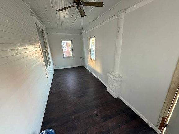 Entrance: Glassed in front porch opens to main part of the house. New laminate flooring insulated walls, thermopane windows. Entrance Foyer: Opens to large living room with drywall, natural woodwork, laminate flooring, new ceiling fan. Dining Room: Large dining room with thermopane windows. Natural woodwork, updated drywall, laminate hard surface flooring. Kitchen: Wood cabinets, new laminate counter top and sink, brick look decor wall, vinyl smooth top stainless range. Second steps to upper level. Small bath located near back porch entrance. Upstairs: 4 large bedrooms. All with hard surface floor, newer drywall in 3 rooms, plaster wall in one room. Bath: Ceramic tile floor, large vanity with cultured marble sink. Basement houses the GFA furnace, water heater, and offers dry storage.