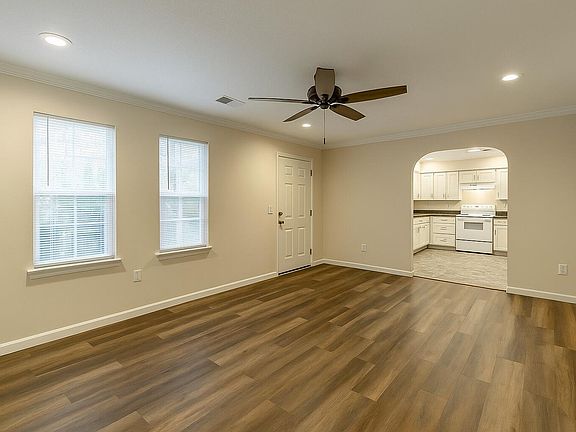 The living room showcases crown molding and new luxury vinyl flooring, setting the tone with a clean, modern feel. The kitchen has been upgraded with new cabinets, countertops, a dishwasher, and a stove—ideal for everyday cooking or hosting. Just off the kitchen, a versatile bonus room offers options as a formal dining room, family room, or home office.