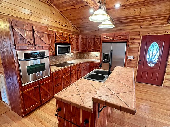 - Ceiling Fan(s), Walk-in Shower, Breakfast Bar, Tile Counters, Vaulted Ceiling(s), Wood Ceiling, Primary Bedroom/Main Lv, Guest Bedroom/Main Lv, All Bedrooms Down, 2 Bedrooms Same Level