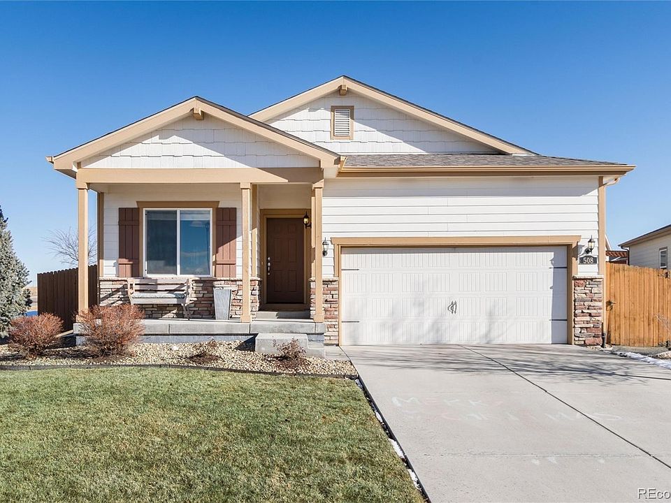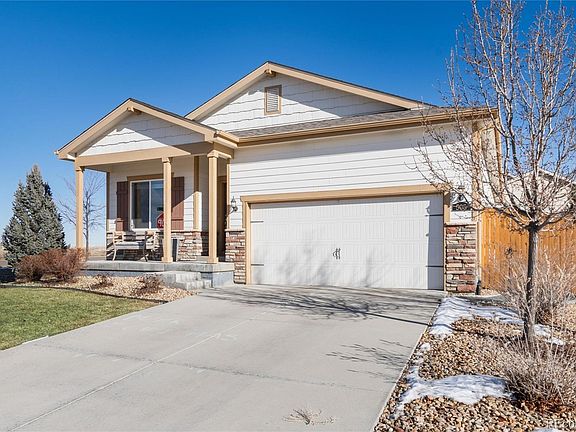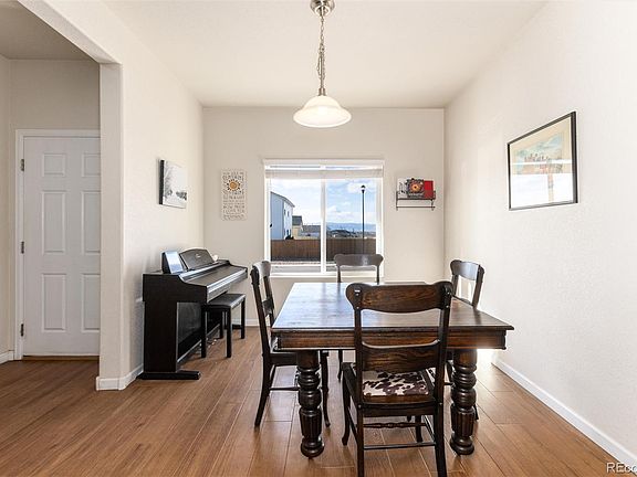 Welcome to this charming 3-bedroom, 2-bathroom home located on a desirable corner lot, offering the convenience of single-level living. The spacious kitchen features generous countertop space, a gas range, pantry, and ample storage. The connected living room and formal dining area make the heart of this home perfect for cooking and entertaining! The primary bedroom is a true retreat with its own en-suite bathroom and a large walk-in closet. Enjoy updated LVP flooring throughout, giving the home a modern, stylish feel. Step outside to the great backyard, where you'll find a raised corner patio with breathtaking views of the surrounding mountains—ideal for that morning coffee or evening glass of wine! The garden beds provide the perfect opportunity for green thumbs to plant and grow their own produce or flowers. Additional highlights include a two-car attached garage, providing plenty of space for parking and storage. Located just across from the upcoming Mega King Soopers and with easy access to I-25, this home offers both convenience and tranquility in this quiet neighborhood! Don’t miss the chance to make this beautiful home yours!