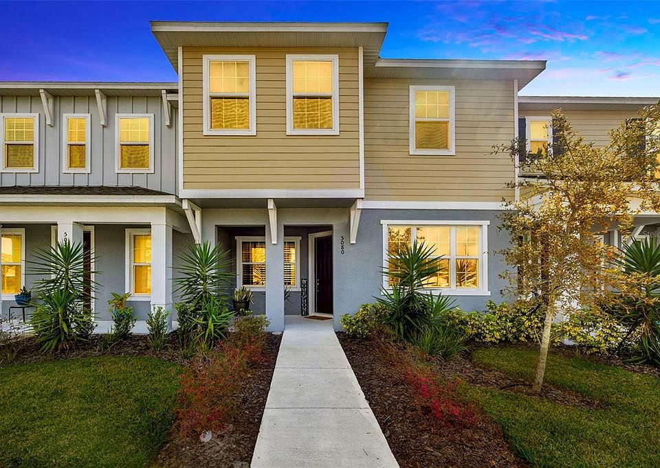 One or more photo(s) has been virtually staged. The Montgomery floor plan by Smith Martin Homes is a 2-story townhome with over 1800sf of living space featuring 3 bedrooms, 2.5 baths PLUS a den, all including a secluded courtyard that leads to the 2-car garage. The home was built in 2022 and looks barely lived in! Enter the home from the covered entryway into the open dining room/great room/kitchen. Just off the entryway downstairs is the office or den with its own private ½ bath. The kitchen features granite counters, stainless steel appliance package, 42” upper cabinets with crown molding and center island with room for bar stools for informal meals. The plantation shutters on the main floor give this home an air of elegance. All the bedrooms are upstairs. The spacious master features an en-suite bath with dual sinks, shower and large walk-in closet. The secondary bedrooms are large enough for a queen-sized bed and each room has a ceiling fan/light, blinds and spacious closet. Just outside the back door is the private courtyard – perfect for relaxing after a busy day, hosting a barbeque or entertaining around a fire pit with friends. The 2-car garage is large enough to include storage. The home backs onto conservation, so no back yard neighbors and is situated in Avalon Park West, a highly desirable community in the heart of Wesley Chapel’s explosive growth. Avalon Park has a top-rated elementary school within the community, resort-style amenities such as the community pool, parks, playgrounds, miles of sidewalks and dog park! This home has access to 2 of Avalon Park’s community pools and is located minutes from I275, I75, Wiregrass Mall, Tampa Premium Outlets, 3 hospitals, restaurants, movie theaters and so much more! Schedule your appointment to see this home today!