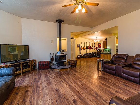 3 bed 2 bath. Light & bright large open floor plan home in private setting. Just shy of 2 ac. Two bay shops with extra storage room, Wood shed with chicken coop, Hiking trails on property, Full Koi Pond with waterfall. May be handicap accessible (buyer to do due diligence. Two bedrooms have built on rooms for additional space, great for office, toy area, hobby room. Covered patio off of DR. Large LR w/floor 2 ceiling windows facing yard