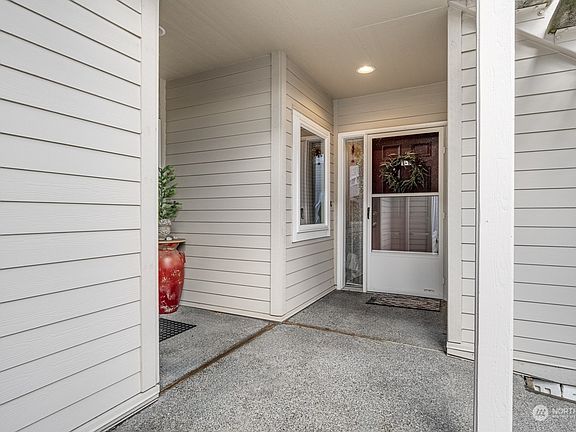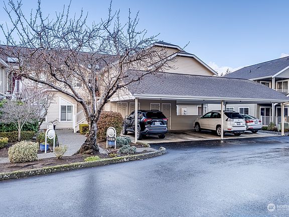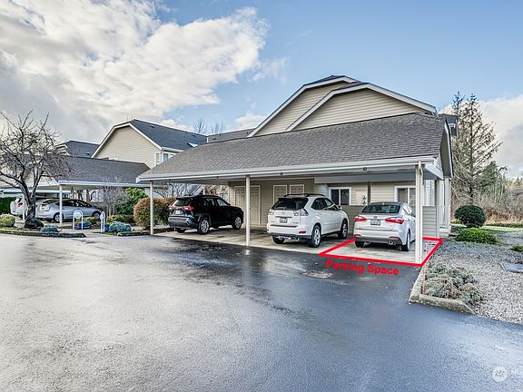 Welcome to the premier 55+ community in Bellingham, Festival Square! A pet friendly community with low monthly HOA dues located close to medical, shopping, parks, trails & the waterfront. This one story condo has been meticulously maintained & has helpful upgrades like new elongated toilet seats, and a custom installed step in shower. The living room has new cellular shades offering privacy while welcoming in the natural light. The generous primary has a walk-in closet & en suite. Enjoy the convenience of a covered parking spot right outside the unit, which is next to your storage closet for additional space. You won't want to miss this ground floor, end unit w/ beautiful views of the pond where you can enjoy wildlife & gorgeous sunsets.