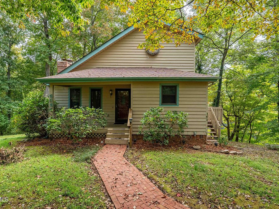 Tucked away in the trees and surrounded below by sparkling water, this lakefront cottage is full of charm and character. The main level welcomes you with an open floor plan where the living room's soaring ceilings, rustic beams, and wall of windows bring the outdoors in.