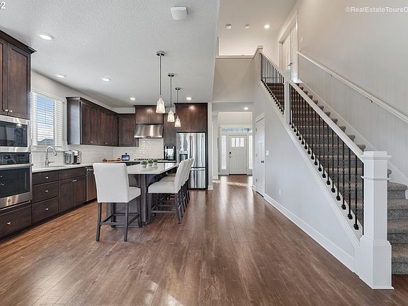 Enter through a vaulted, double-height foyer that creates an immediate sense of space and light. The open great room flows naturally into the dining area and kitchen ideal for entertaining or relaxed family time. The kitchen features quartz countertops, stainless-steel appliances, and a separate pantry tucked under the stairs for additional storage.