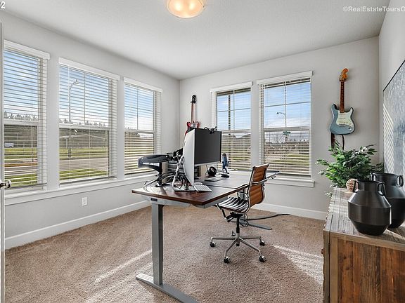 The primary suite on the main level offers convenience and privacy, with a walk-in closet and dual-vanity bath. A dedicated office near the entry provides a quiet workspace with natural light perfect for remote work or study.