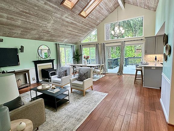 Feel like you're living in a remote cabin in the woods but with the quick commutes and the modern updating you've been waiting for! Hike the Ridgeline trails or the Amazon pathways right from your back door, commute to the University of Oregon on protected bike lanes, or relax on your expansive back deck to the sounds of PNW birdsong. With lofty 14' vaulted ceilings, three skylights, and plentiful windows, this open concept home pulls in the natural setting and feels like a home with a much larger footprint. The modern kitchen adds beauty and ease to daily life with its quartz countertops, marble herringbone backsplash, upgraded storage solutions, soft close drawers, oversized peninsula with seating, and stainless steel appliances. Owned for nearly 14 years, the home was not a flip but was updated from top to bottom with livability as the goal. From the big ticket items like kitchen, roof, gutters, HVAC, and hot water heater, and even all the way down to new "pet proof" carpet, bedroom closet organization, and new exterior paint. Ask your realtor for a list of the updates and come tour this hidden gem today! Seller is a licensed real estate agent in the state of Oregon.