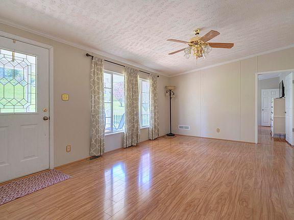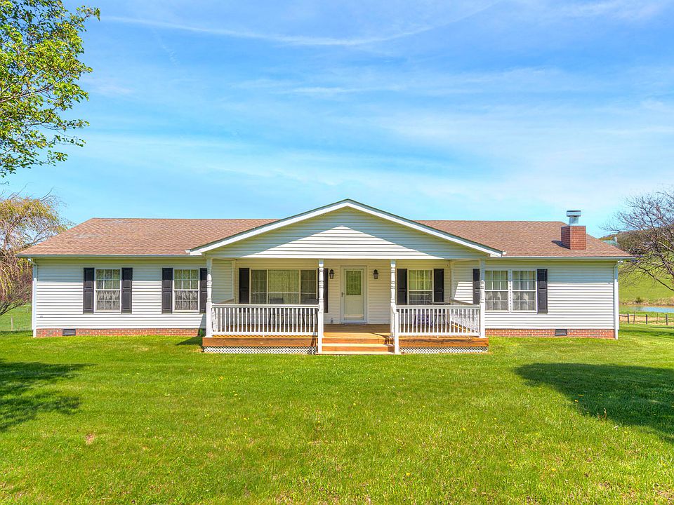 Perfectly situated on 2 acres with rolling hill views, this lovely home provides you privacy that will have you feelin' like you have escaped to the country while enjoying the conveniences of quick drive to amenities & attractions. Easy care laminate flrs & high ceilings highlight starting in the spacious living & dining rms. Sunlight pours in creating a comfortable atmosphere for daily life. Easily entertain in front of wood burning fireplace in the open dining rm. Built-in cabinets/shelving create an easy serving station, or perfect spot for photos/treasures. Connecting kitchen is loaded with oak cabinets, center island with bar seating & SS appliances. 3 bedrooms including primary w/bath & WI closet. Spacious deck, above ground pool, fenced garden area, chicken coop & playground convey.