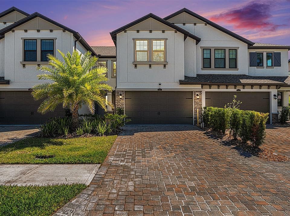 One or more photo(s) has been virtually staged. Prepare to be impressed! This stunning 3 bedroom, 2.5 bath townhouse located in the sought after community of Estancia at Wiregrass is ready for a new owner.  Prepare meals in the modern kitchen featuring quartz counter tops, soft close cabinets with dovetailed drawers, under cabinet lighting and high end GE appliances including a GAS stove. Beautiful custom designed built-ins provide versatility for decorating in the living room. Tile plank flooring flows throughout the 1st floor adding both style and durability. The spacious primary suite boasts a tray ceiling and a custom walk in closet. Upstairs, a loft provides extra space for your personal needs. The two car garage has epoxy flooring and a large storage closet.  Enjoy outdoor living on the extended paved lanai with screen enclosure. Additional features include a whole-home water treatment system with reverse osmosis in the kitchen and Rinnai instant hot water.   Walk to the fully appointed amenity center which includes a lap pool, a pool with waterslide, tennis courts, and fitness center. The community also features walking trails and a dog park. This home blends elegance, comfort and convenience in a prime location. You'll feel like you are on vacation every day!