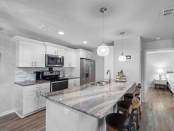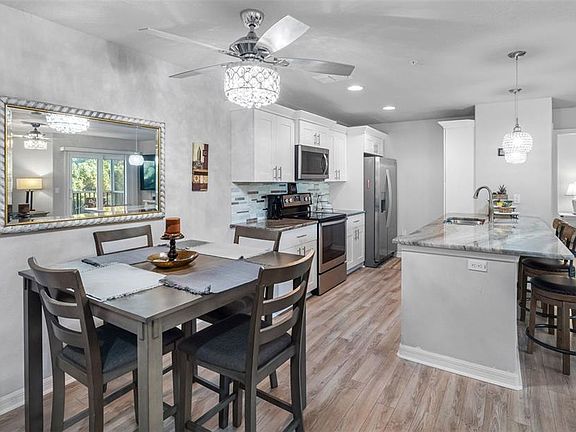 Discover the perfect blend of urban energy and coastal living in this beautifully upgraded 2-bedroom, 2-bath condo in the heart of Downtown New Port Richey. Enjoy walkable access to restaurants, parks, festivals, and nightlife, plus convenient boating and kayaking on the Cotee River and nearby private beach access. Inside, an open layout features laminate flooring, upgraded lighting, a 65" TV, and a Nest thermostat. The kitchen offers granite countertops, stainless steel appliances, extended workspace, crown molding, and a spacious pantry. Both bathrooms have been updated with granite, designer tile, and glass shower doors. A standout feature is the fully air-conditioned bonus space, perfect for climate-controlled storage, a home office, hobby area, or an entertainment room for you and your guests. The primary suite includes a walk-in closet, and the screened porch provides peaceful wooded views. Additional highlights include hurricane-impact windows, inside laundry with newer front-load washer and dryer, and a rare 2-car garage offering secure parking and extra storage. This second-floor unit also provides elevator access and a community pool for easy living. Turnkey and move-in ready—with select furnishings included—this condo also presents an excellent investment opportunity, offering strong rental appeal in one of the area’s most desirable and walkable locations. Enjoy the best of New Port Richey living—coastal charm, vibrant downtown life, and effortless river access all in one.
