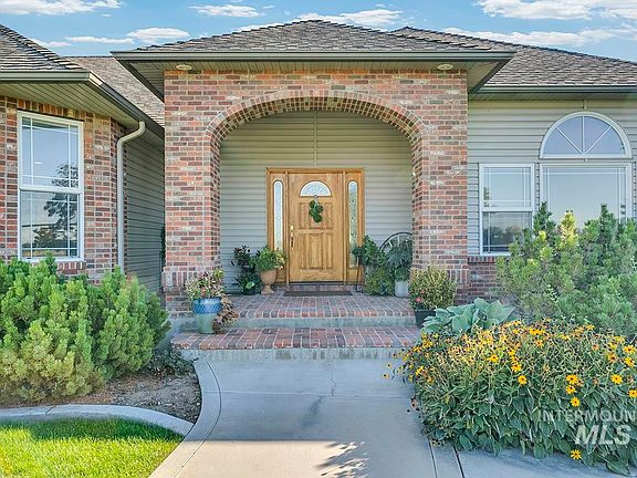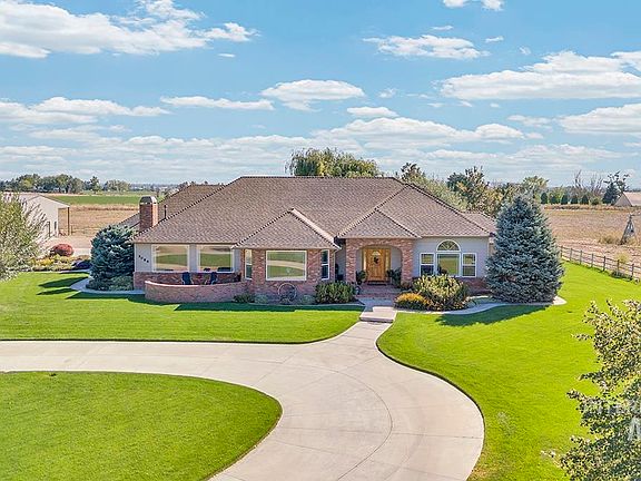Prime location, single-level 10-acre estate at the end of tree-lined private lane with easy freeway access in Meridian! Pristine privacy & views + home business opportunity. Gourmet kitchen is the center of the home with prep sink, walk-in pantry, extensive cabinetry & expansive counter space, island seating + breakfast bar open to vaulted family room with exposed beams, brick-encased fireplace and custom built-ins, along with dedicated office perfect for work-from-home.The light-filled dining area seamlessly engages the kitchen and opens to the front courtyard, perfect for taking dinner outdoors to enjoy the views, while covered back patio allows for BBQ year-round with further spectacular, private scenery. Laundry room (sewing station, folding counter, freezer, ironing board, and utility sink) connects with mud room & oversized 3-car garage with add'l storage room. Central vac, dual HVAC, water softeners, private well, and septic system make this beauty beyond functional. Land is irrigated by Zimmatic pivot & 3-phase power to fuel farming & homestead opportunities. Add to that the mature landscaping, extensive paved drive and 30x30 shop w/ 17’ RV bay doors, inside loft & insulated office to run a business from. Add'l RV parking space, power/dump & pole barn off shop.