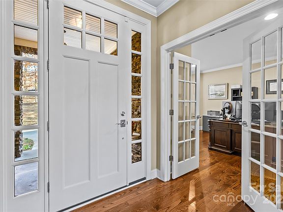 The main level includes a beautiful primary suite with his-and-her closets, dual vanities, a soaking tub, and a walk-in shower. A dedicated home office overlooks the professionally landscaped front entry. The chef’s kitchen is equipped with abundant counter space, granite countertops, a large island with extra storage, custom cabinetry, walk-in pantry, and under-cabinet lighting. A separate dining room sits just off the kitchen for easy entertaining.