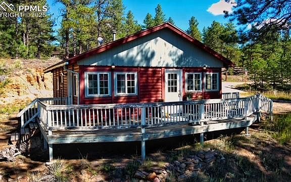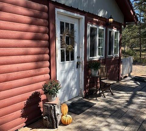 Midcentury sweet log sided cabin among the pines and perched above to view the mountains. All within walking distant to Florissant proper, library and park. Two bedrooms and sleeping loft above. Beautiful wood ceiling and lots of windows throughout. Enjoy the view on a wood deck spanning the front of the cabin. Would make a perfect air bnb if you want to share it or make it your own mountain cabin.