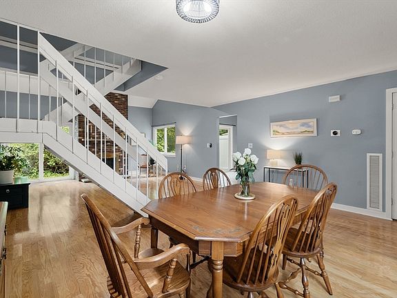 In-unit laundryPrivate wooded backyardUpdated white cabinetsStainless-steel appliancesSoaring cathedral ceilingsLots of windowsGleaming wood floors