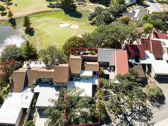 SPACIOUS TOWNHOME WITH PREMIER VIEW OF RIVERHILL GOLF COURSE AT 17TH FAIRWAY & GREEN. Large open Great Room with Kitchen, Dining, Living, and glass across the back to enjoy that beautiful view! Classic saltillo tile in the entry, dining, and kitchen with a peninsula cooktop and breakfast bar. Step down onto wonderful wood flooring in the large living area with high ceilings, a masonry wood burning fireplace, and a dry bar. Enjoy the views of the golf course below through the plentiful windows, or step outside onto the shady patio to enjoy the peaceful view outdoors. Two bedrooms and the laundry room are also on the first floor. One of the two 1st floor bedrooms (with a view) offers an ensuite bathroom (shared with the hallway), so this can be used as a master suite. However, upstairs you'll find another amazing master suite where you can enjoy the view from an approx 27'2" X 15'8" bedroom, offering a 14'11" X 11'7" bath with both a tiled shower and a jetted tub, and a 14'6" X 7'11" walk-in closet. The garage is over-sized to comfortably house two full-size cars and a golf cart. A workshop is located off the garage for tinkering. This beautiful home has it all.