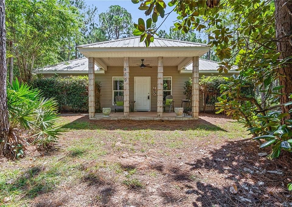 Tucked away beneath the trees on the east end of Dauphin Island, this inviting ground level home offers coastal living with peace of mind. This property is located in the highly sought-after X flood zone, so flood insurance is not mandatory! Step inside to an open concept floor plan that welcomes you with a spacious living area, perfect for gathering with family and friends. The kitchen includes wood cabinetry, a breakfast bar, a pantry, and is open to the dining room, making it ideal for both everyday living and entertaining. The split floor plan provides added privacy, with the primary suite situated on the east side of the home. It features a walk-in closet and an ensuite bath. Two additional bedrooms and a full bath with laundry are located on the opposite side, offering plenty of space for guests or family. Outdoor living is just as enjoyable, with a large cement patio surrounded by palmettos and natural woods - perfect for grilling and outdoor living. The covered front porch is nicely shaded and offers a perfect outdoor spot to enjoy your morning coffee or a glass of wine in the evening. Ideally located near Cadillac Square, the 7 mile recreational trail, the 100+ acre Bird Sanctuary, historic Fort Gaines, and the Mobile Bay Ferry. You will enjoy the best of nature, history, and island lifestyle, all within walking distance. Don't miss your chance to start living your Island Life! Schedule a showing today! *Buyer accepts responsibility to review deed restrictions, zoning or local regulations, and other matters or record. Buyer to verify all information independently. Any and all updates are per Seller(s).