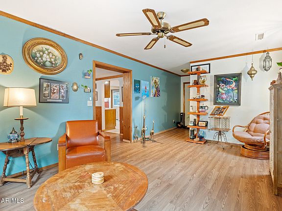 Tucked into a peaceful, park-like setting in the heart of Prescott, this charming home feels worlds away yet sits just minutes from shopping, restaurants, the World's Oldest Rodeo, and historic downtown. Set on over half an acre with towering ponderosa pines and dramatic boulder outcroppings, the property is fully perimeter fenced and welcomes you with a covered front porch entry and a spacious detached three-car garage with room for a workshop and extra storage.Inside, the home offers a warm and inviting atmosphere from the moment you step into the cozy living room, an ideal space for relaxing or gathering with guests. Just beyond, an oversized family room expands your living space and flows into a versatile office or art studio area, perfect for working from home or pursuing creative hobbies.The adjacent kitchen is both functional and welcoming, featuring abundant cabinetry, a large pantry, an eat-in dining nook, and a newer refrigerator. Its open feel makes everyday meals easy and keeps the cook connected to the rest of the home.The generous primary bedroom provides a comfortable retreat with an oversized walk-in closet and an ensuite bath offering a walk-in shower, raised vanity, and comfort-height toilet. Two additional bedrooms enjoy views of the surrounding boulders, include ceiling fans for added comfort, and are served by a full hall bathroom. A large laundry room and convenient half bath complete the interior, all enhanced by easy-care hard-surface flooring throughout.Out back, a delightful covered patio invites you to enjoy Prescott's beautiful afternoons year-round while you take in the serene, park-like surroundings. The expansive, level yard offers plenty of usable space for gardening, play, pets, or any outdoor hobby, all framed by pines, rock formations, and the sense of privacy that comes with having a bit of room around you. Well-maintained and thoughtfully laid out, this centrally located property combines in-town convenience with a tranquil, retreat-like feel plus the added bonus of a detached three-car garage and extra storage shed.
