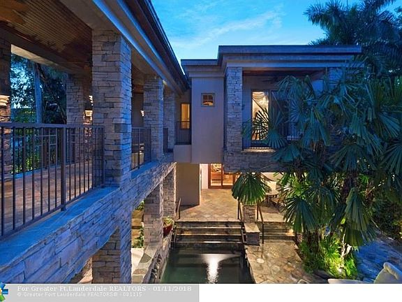 Frank Lloyd Wright-inspired design harmonizes with the Zen-like oasis of this custom compound-like Intracoastal estate complete with a lift-equipped dock. Comfortable open living areas are set off by signature hardwood and stone accents. Smart-house automation is featured. Between the main residence and private guest house, the serene pool courtyard is designed as an exquisite composition of lush foliage, water, stone and wood. The desirable location is near Las Olas Boulevard and the beach. 40' Boat slip.