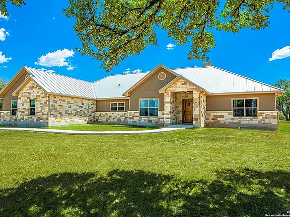 ***OPTIONAL SELLER FINANCING AVAILABLE...Contact Agent for information*** Come see and feel the Allure of Country Living...Beautiful, meticulously kept ranch home on a 2.77 acre corner lot could be yours!  This tranquil haven, nestled on a tree covered lot, offers Hill COuntry charm and peaceful living where you can spend your days indulging in afternoons relaxing on the covered patio, frolicking in the Medina River at the HOA river park, spending your evenings watching beautiful sunsets or sitting under star filled skies around a campfire. This 2970 sq. ft home boasts a 16' high great room ceiling with an open concept.  There is a beautiful floor to ceiling stone fireplace in the living area, concrete floors and lots of ample natural light.  The spacious kitchen features include a breakfast bar/island combo with granite counters, a walk in pantry and double ovens. The property is complete with a three car attached garage, a detached RV Barn/Garage and is totally fenced with an electronic gate.  The RV Barn has 12' high doors, is fully insulated, has three doors which provides the ability to pull-through on one side aand a 50 amp outlet. An additional 30 AMP outlet is on the electrical pole next to the driveway. Mustang Crossing allows for one horse per two acres and has an equestrian trail for your riding or walking pleasure. Seller extends an invitation for you to schedule your showing today!