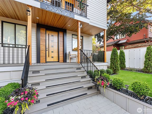 Better than new construction on a peaceful Phinney Ridge street. Owner/builder meticulously rebuilt this house in 2023 as his own house. High end thoughtful touches throughout: high ceilings on main and upper floors (most bedroom doors are 8'), gorgeous engineered hardwoods on both levels, even the stairs. Stunning great room features living rm with gas fireplace, large dining area, & total chef's kitchen with quartz counters, Bertazzoni 6 burner stove/oven, pot-filler, walk-in pantry, etc. 4th BR/office on main floor. Upper floor has 3 beds, 2 full baths, including an incredible primary suite with its own covered deck. The 2 other bedrooms share a covered balcony. Efficient mini-splits for heating & cooling. Driveway parking off alley.
