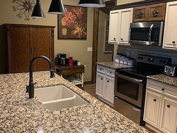 Kitchen features granite countertops with stainless steel appliances with walk in pantry