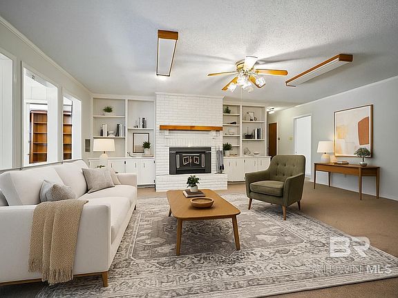 REDUCED FOR BUYERS UPDATING IF DESIRED. (Currently has varnished/stained bedroom doors, closet doors, and bathroom vanities.) Purchasing As Is except for Heating, AC, electrical and plumbing. Well Maintained one-story brick ranch home on a FLAT 83x144 lot on 7th fairway of Lake Forest Golf Course! This home has an inviting front porch that extends the width of the house! New 30-year agriculture- fortified Roof means lower cost on insurance!! Enjoy the serene view of the golf course from the great room, sunroom and home office! Many built in bookcases in great room and office! Split brick floor in foyer, a Generous size Living/Dining combo, great room with insert in fireplace, LVP flooring in kitchen, breakfast area with bay windows, laundry room, and sunroom! Large primary bedroom with 2 closets. Double carport on rear of home for easy parking and privacy. This home is convenient to shopping, easy access to I-10 , schools, and near Daphne High School, 3 pools, Golf course, riding stables, and tennis! This home checks all of the boxes! Call today to view the home! Listing info deemed correct. Buyer to verify all info during contingency period. Agent remarks. Home is vacant and can be shown without an appointment. Sentri lock box on front door, combo on back. Realtor owned and ready to sell. Buyer to verify all information during due diligence.
