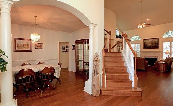 This was the model home during the original development of the neighborhood and you can see why. The floor plan provides an excellent use of space from the open layout to details like built in shelving, a split staircase, columns, and arches. It lives like a single story with the master suite and study downstairs.