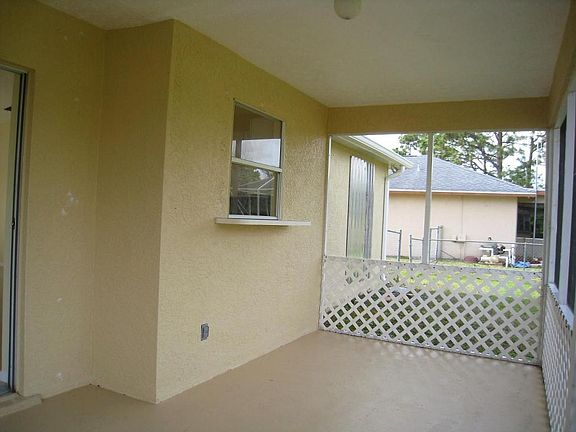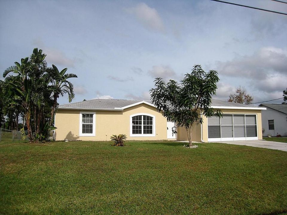 Cozy home with new tile in living area's and master, carpet in guest bedrooms. Bathrooms have been updated, new appliances, kitchen sink, faucet and range hood. CBS construction, and storm shutters. Screened porch with fenced yard backing a drainage easement. Well and pump on property for future irrigation. Many fruit trees including 3 mango trees, avocado, naseberry and ackee. Garage has sliding screens.