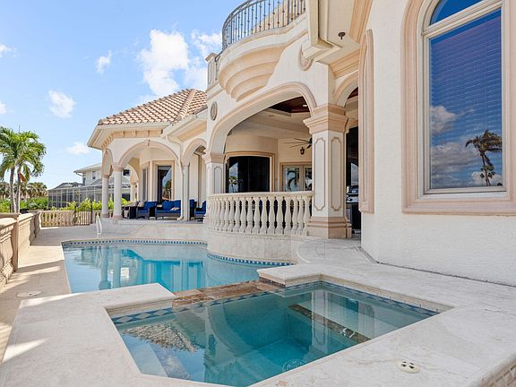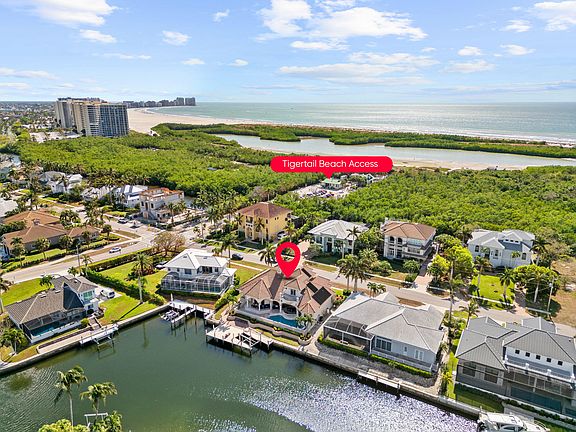 Stunning one of a kind custom home directly across from Tigertail Beach on Marco Island. Offering 3 bedroom, 3 1/ 2 bath plus den and large flex space, the 3,920 sq ft residence boasts elegant interiors with marble floors, volume ceilings, and a bright, open kitchen with granite countertops and stainless steel appliances. The spacious layout includes a large family room with custom built-ins and fireplace, formal and informal dining areas, and a beautifully appointed office with French doors. The first-floor master suite has lanai/pool access, water views, spacious sitting area and a luxurious en-suite bath. Upstairs, two additional bedrooms offer private balconies with breathtaking views, while a versatile flex room doubles as a bedroom with a wet bar and a Murphy bed. Outdoor amenities include almost 2000 sq ft lanai with a long water views, heated pool, spa, and outdoor kitchen. Electric shutters and shades on the Lanai accommodate all types of weather. Custom built with high-end construction including top of the line Anderson Impact windows and doors, extra reinforcements on the tile roof, extra insulation, keystone finishes and more. Enjoy a day at the beach or just a short distance to see a spectacular sunset, the beach entrance is less than 500 ft away. Complete with a large boat dock, this home offers luxury and coastal convenience in a prime location. Don't miss your chance to own this piece of paradise!