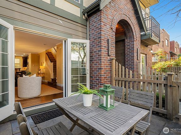 Trophy location! Beautifully built townhome has all the right spaces in all the right places. Main floor boasts high ceilings, oak floors and custom mill work throughout. Open floor plan features well appointed kitchen, and living room with gas fireplace that seamlessly extends to a charming courtyard. Three bedrooms including a full-floor primary suite with stellar views. Watch the sun set from the rooftop deck and soak in views of the Space Needle, Mt Rainier, Elliott Bay and the Olympics. Radiant heating throughout. Coveted two car tandem garage with voluminous storage. Classic brick exterior and cobbled driveway complete the European vibe. Truly an easy and elegant lifestyle that is close to the action, yet completely out of the fray.