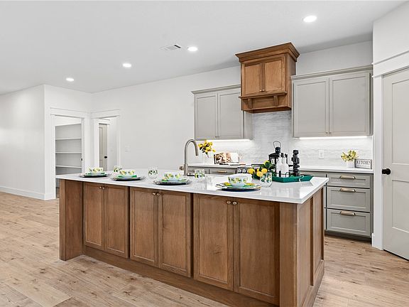 complemented by built-in shelving, electric fireplace, & access to outdoor patio. Spacious kitchen is a cook's delight, w/an abundance of cabinet space, a large island, & two pantries for added storage.