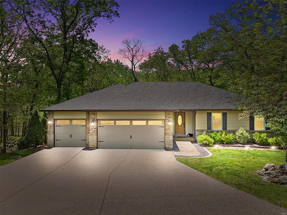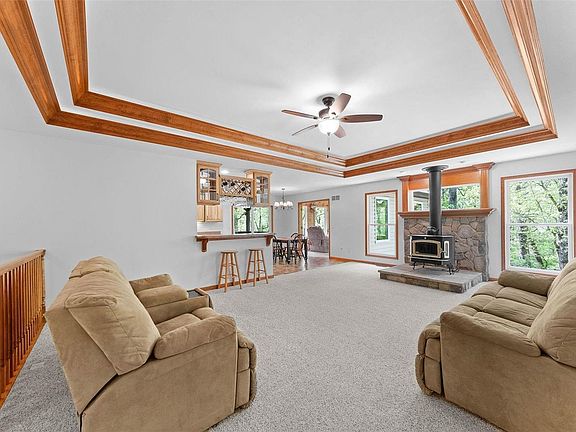 Please continue to show, accepting a back up offer! Welcome to your dream home! 5 bedrooms, 3 full baths on over 3.5 wooded acres in a quiet neighborhood. You will love the open floor plan & special touches! The great room features crown molding, coffered ceiling & a wood burning stove. The kitchen has a down draft cooktop & 42 inch staggered custom cabinets with lots of counter space, and a pantry . The sunroom has a pine ceiling & walls with gorgeous views. The master bedroom has double crown molding and coffered ceiling plus an entrance onto private deck. There is a second large bedroom on the main level plus an office/den with custom built shelving. The finished lower level has a huge family room with a kitchenette and 3 more bedrooms plus plenty of storage and a walk out to a large patio This is a lake front lot, so grab your fishing pole and enjoy the water. MF and LL laundry. Living here is like being on vacation all of the time! Additional Rooms: Sun Room