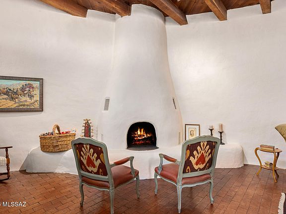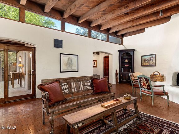 Private & secluded this authentic mud adobe is nestled in a hidden enclave in the Ft. Lowell Historic District that transports you to San Miguel de Allende. Here you'll discover a perfect blend of hand-crafted construction techniques using natural materials w/modern comforts. Split floor plan features soaring wood-beamed ceilings, abundant natural light w/beautiful open living, dining, kitchen & breakfast areas. Masonry fireplace w/ sweeping hearth, gleaming brick paver floors & walls of glass open to a lush courtyard w/ pool, shaded porch & mesquite grove. Generous primary suite features sitting area & glass-door private access to rear outdoor spaces. Recent upgrades incl hand-crafted alder cabinetry/storage in primary bath, enclosed garage w/ new windows & custom wood door. Spectacular!